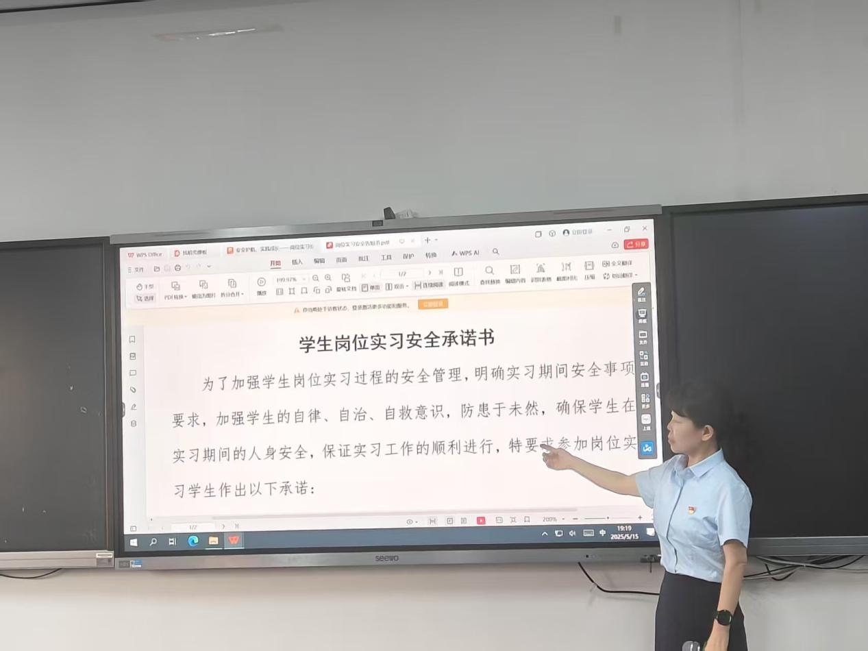 各系专业带头人、骨干教师,实习指导老师代表详细解读了各专业实习计划,涵盖实习单位的分配原则、实习时间的起止节点、实习期间的工作任务与要求等内容。现场组织学生签订安全告知书,对实习前,实习中,实习后注意事项及要求方面,教师们更是进行了细致入微的讲解,实习前对实习学生进行安全防护知识、岗位操作规程教育和培训,实习中依据学校的实习要求,平台签到、实习日志撰写,并在实习结束时提交实习报告,实习结束后考核,从人身安全、生产安全到网络信息安全等各个维度,通过实际案例警示学生提高安全防范意识,严格遵守实习单位的安全规章制度,确保实习期间自身安全万无一失。同时,针对实习手续办理流程,包括实习协议的签订、实习材料的准备与提交等,教师们也进行了耐心且清晰的说明,帮助学生顺利完成各项准备工作。