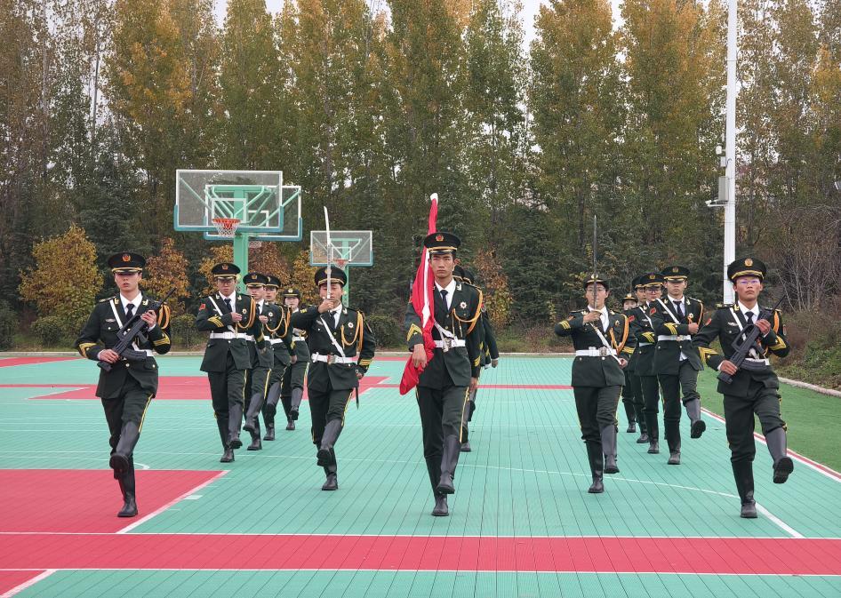 七时五十分,仪式在激昂的进行曲中拉开帷幕。擎旗手24建工管理王荣与护旗手25机械制造黄浩然、韩俊杰迈着铿锵有力的步伐,在指挥手24机电技术9班杨立、25人工智能2班谢伊代·买买提的精准指挥下,将国旗护送至升旗台。
