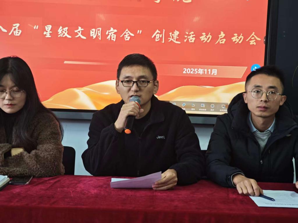 李帅老师进行了活动动员讲话。他就“星级文明宿舍”创建活动提出了三点期望:一是以文化建设立标准,让宿舍有品质更有内涵;二是以协同共治担责任,让宿舍有温情更有力量;三是以作风传承促成长,让文明有活力更有生命力。