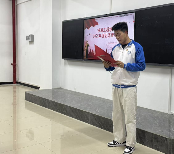 第三项,新生志愿者代表25铁道工程3班的王梓畅同学在会上发言。他结合自身理解,从“坚守初心,认真履职”、“主动学习,提升能力”、“团结协作,形成合力”、“持之以恒,担当责任”四个方面,表达了新生志愿者积极投身服务、践行志愿精神的决心,展现了新一代铁道学子良好的精神风貌。