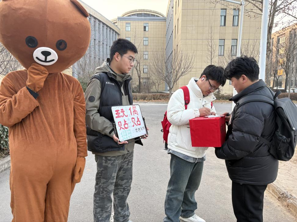 活动现场氛围热烈而温馨。起初略显羞涩的同学们,在志愿者的热情邀请下逐渐放松,纷纷走向“抱抱使者”,用一个简单却有力的拥抱传递心声。接着,同学在拥抱后纷纷写下自己的感悟,放入在现场的“心灵寄语箱”里:“这个拥抱让我感受到了集体的温暖”、“压力好像在拥抱中消散了”。学院老师也在现场与同学们亲切交谈,用实际行动拉近与学生的距离,诠释“以生为本”的育人理念,成为活动中最动人的场景。参与拥抱互动的师生还获得了布朗熊玩偶送出的小礼物,让温暖持续传递。