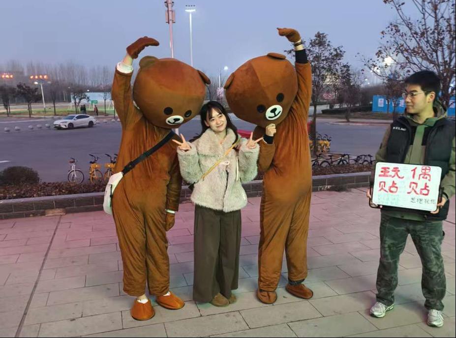 活动前期,学院学生会精心筹备,在现场设置“暖心拥抱站”,并安排身着布朗熊玩偶服的“抱抱使者”热情迎宾,让过往师生感受到满满的诚意与暖意。学院辅导员鼓励大家勇敢敞开怀抱,在真诚互动中感受温暖与支持。