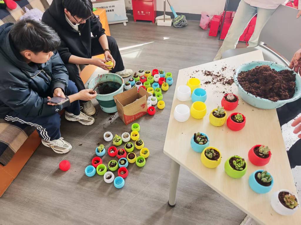3月24日下午,绿植种植体验活动如期开展。活动现场,同学们热情高涨、兴致盎然,认真学习多肉植物的养护知识,亲手完成选盆、装土、栽种、浇水等一系列流程。大家轻捧幼苗、细心培土,在动手实践中放慢节奏、静心专注,在与泥土和绿植的亲密接触中释放压力、舒缓情绪,真切感受生命萌发的力量与照料生命的治愈感,现场氛围温馨而美好。
