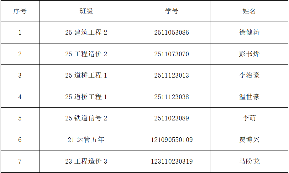 由于未返校办理退学相关手续,现予以公示,该公示视为退学告知书已送达,公示期自2026年3月25日至2026年3月29日,为期5个工作日,公示期间,有异议可向铁道工程学院提出书面异议,并写明理由和依据,异议人要写明真实姓名和联系方式,否则不予受理。