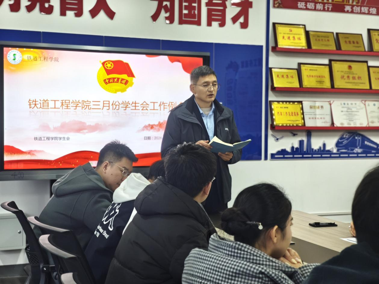 最后,李帅主任作总结发言。他首先传达学校2026年党政工作要点中提出的“深入解读‘铸魂、传承、强基、淬炼、解惑’五项行动”的内涵,要求学生会工作紧扣学校、学院发展大局,落实立德树人根本任务。他充分肯定全体学生干部上学期的辛勤付出与工作成效,并对大家提出三点希望:一要强化使命担当,发挥先锋模范作用,以身作则、严于律己,在学习和工作中做好表率;二要传承优良作风,做好接力传承,发扬学生会团结奋进、踏实肯干的优良传统,以老带新、凝聚合力;三要勇于创新突破,丰富活动形式,结合铁道工程专业特点,创新工作方法,打造更具吸引力、感染力的学生活动,切实服务全院学生成长成才。