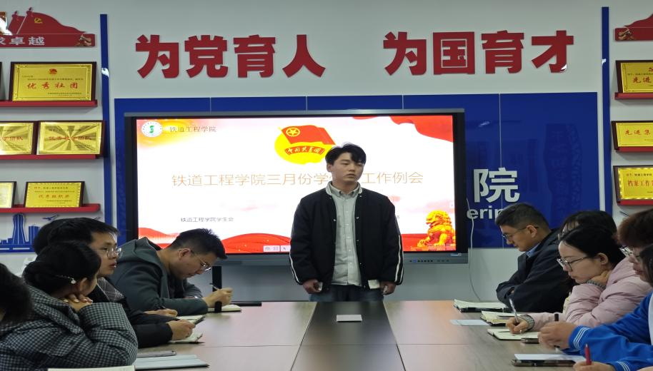 为总结过往工作经验,明晰新学期工作方向,凝聚学生会队伍合力,推动学院学生工作提质增效,3月18日下午六点半,铁道工程学院在行知楼南207会议室召开三月份学生会工作例会。学院学生工作办公室主任李帅,专职辅导员张帅、王晓雪、蔡鹏飞、刘昊信,学工干事王佳媛及学生会20余名学生干部参会,会议由学院专职辅导员杨颖老师主持。