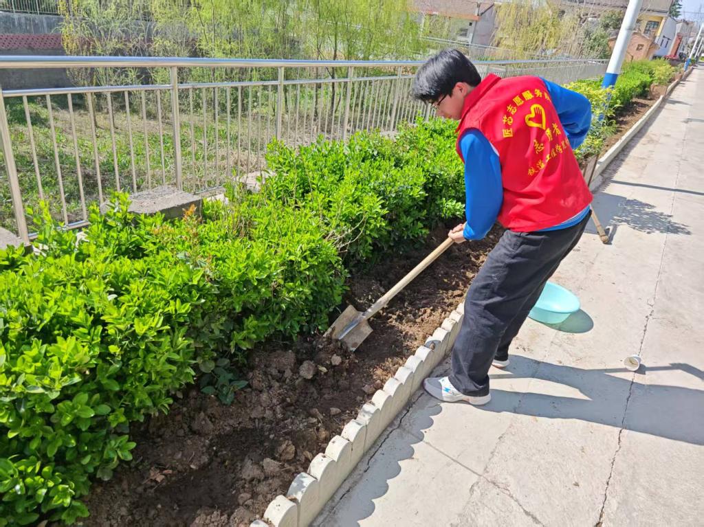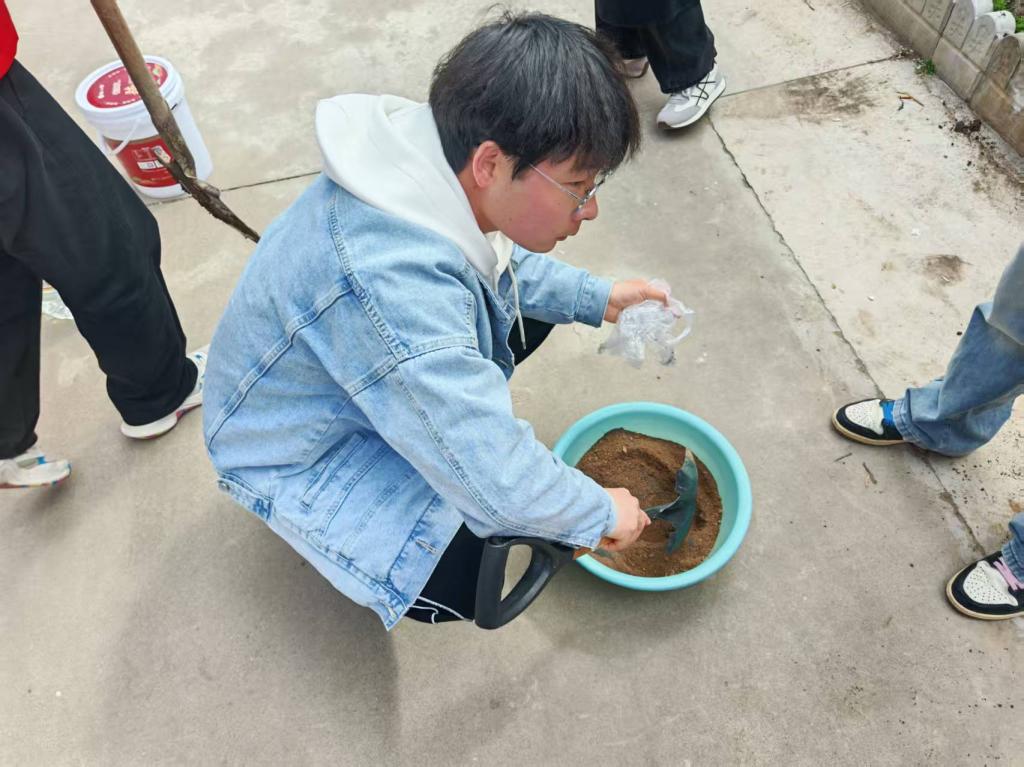 活动现场,志愿者们精神饱满、分工明确,迅速投入到各项实践任务中,分为绿植培育和环境清扫两个小组有序开展工作。在绿植培育区域,同学们在辅导员的指导下,认真学习花卉种植技巧,从松土、播种到浇水,每一个环节都一丝不苟、有条不紊。大家小心翼翼地将花种撒入土壤,浇灌清水,亲手为北社村增添一抹新绿、注入一份生机。躬身劳作的过程中,同学们暂时放下学业压力,在与自然的亲密接触中舒缓身心、调节情绪,在感受生命成长的美好中培养耐心与责任感,既体验了劳动的乐趣,也实现了心理的放松与疗愈,深刻体会“一分耕耘,一分收获”的劳动真谛与心灵滋养的双重意义。