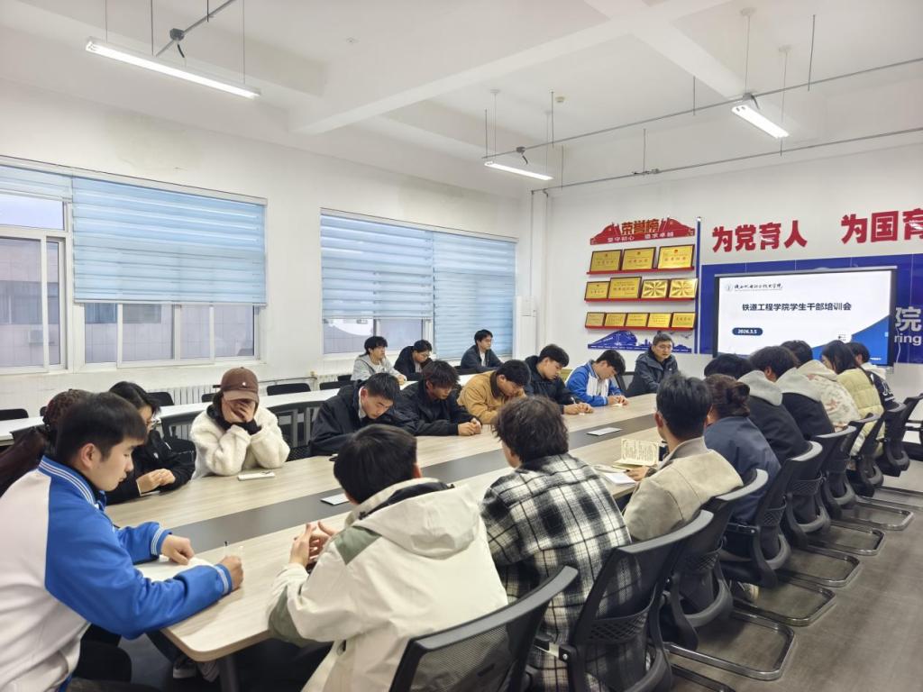 为进一步强化学生干部队伍建设,提升学生管理工作质量,切实发挥学生干部在学院与学生之间的桥梁纽带作用,铁道工程学院于2026年3月5日晚上召开2024级学生干部培训会。本次会议由学院学生工作办公室主任李帅主持,专职辅导员杨颖、蔡鹏飞,以及学院2024级各班团支书、班长参会。